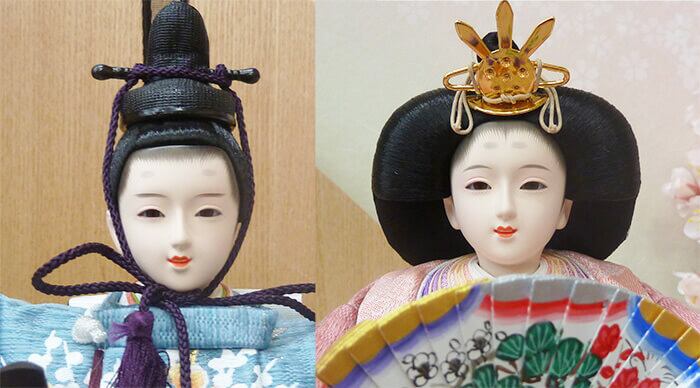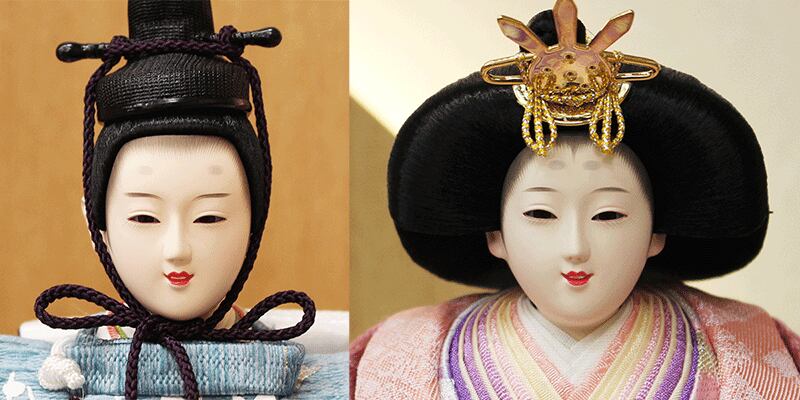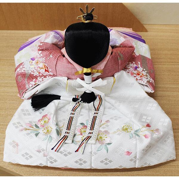淡い青色とピンク色の衣裳着には、金彩絵付けと刺繍が美しい京都西陣織物を使用し、十二単衣本仕立てで仕上げました。お殿さまの束帯には、魚帯・石帯仕上げの裾下襲を、お姫さまは重ねの技法を凝らした十二単に、裳袴には五色の引き腰と繊細な刺繍細工を施しています。細部にまでこだわり、木製の手を使用したプレミアムな逸品です。