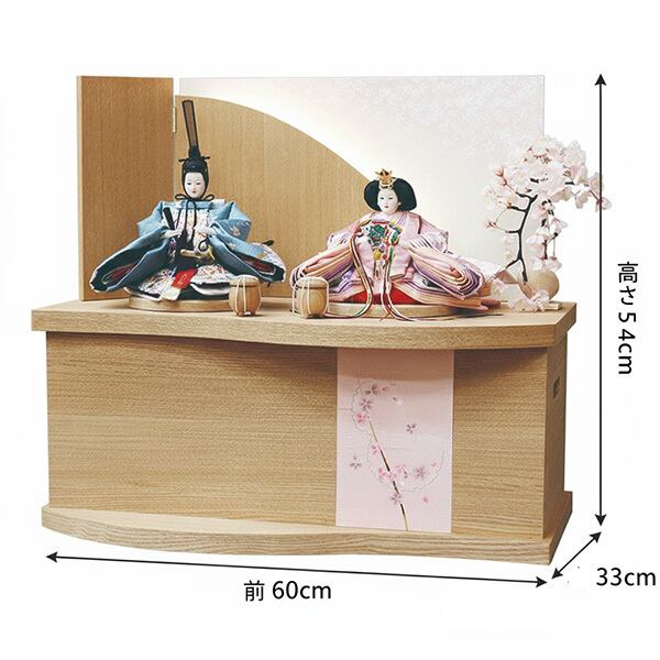 人気の白木仕立てのお屏風台は、和紙張りに小紋桜模様をデザインした、おしゃれな収納飾りセット。お屏風に搭載されたLED間接照明は、コンセントに繋ぐと幻想的な光でお人形を一層引き立てます。リビングや洋室にも調和するコンパクトサイズの雛飾りで、特別なひな祭りをお迎えください。