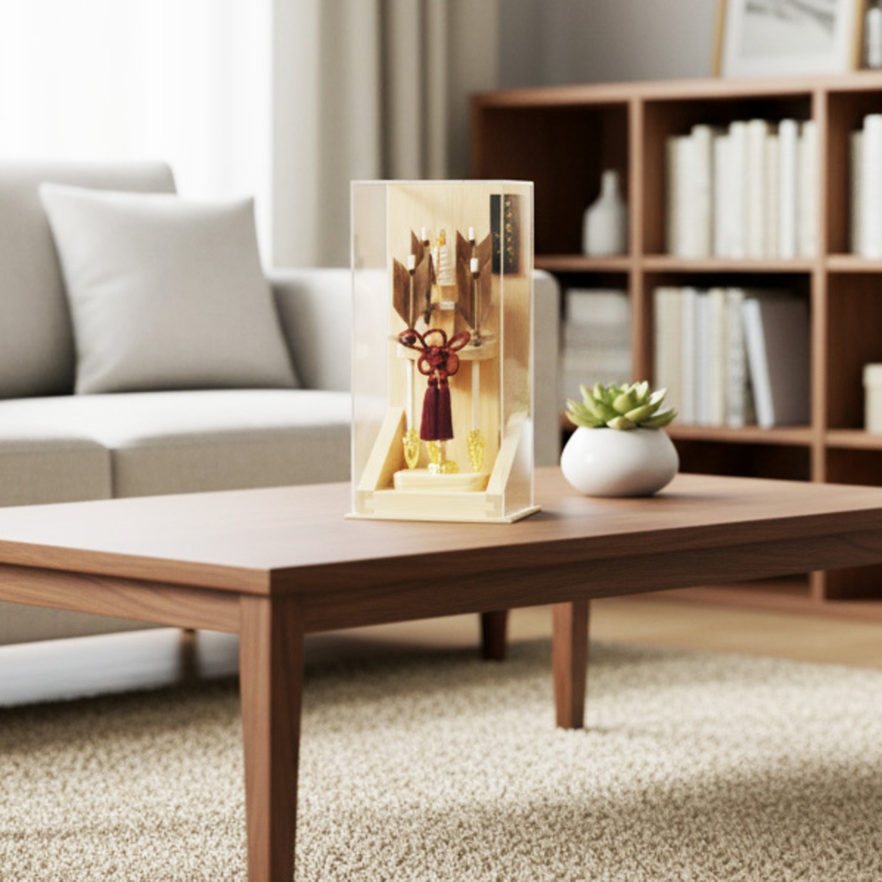 ■ 飾り場所に困らないコンパクト設計 前幅14.5cm、奥行き10.5cm、高さ28cmと、極限までスリムに設計。リビングや玄関など、洋風の空間にもすっきりと馴染み、置き場所に困りません。アクリルケースは軽量でお手入れも簡単です。