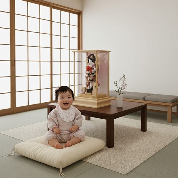 平安道翠監修8号京羽子板は、伝統工芸士「匠一好作」のハイグレード仕立てのおしゃれなミニ羽子板を使用しました。上品な手書きのお顔と金彩刺繍仕立ての振袖羽子板は、大好評を頂いております。ケースは、総檜造りのガラスケースです。バックパネルには、小桜花丸模様が描かれています。省スペースで飾れるマンションタイプの高級羽子板ケース飾りです。