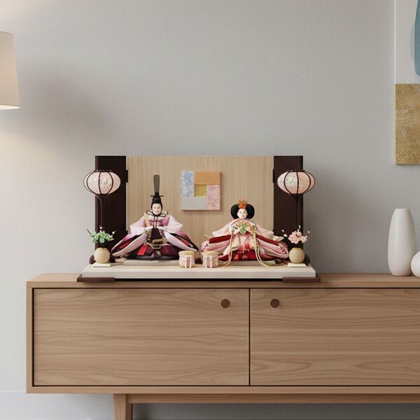親王揃いは、紫と赤のぼかし染のお衣装に花柄の刺繍細工を施したとても美しい親王飾りです。お屏風お飾り台は木の質感を生かしたグレー塗りの家具調仕立てで、絵紙細工を使ったおしゃれでコンパクトな平飾りセットです。横幅52cmのコンパクトサイズでサイドボードなどにもお飾り出来る省スペースで飾れるミニ親王飾りです。リビングや洋室にピッタシのプレミアム仕上げの創作雛人形です。