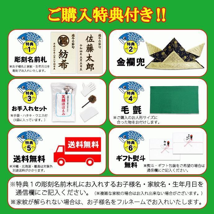 特典品として、レーザー彫刻仕上げの家紋名前木札と可愛い金襴兜を添えてお届けいたします。