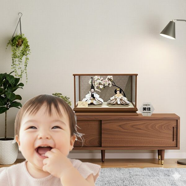 萌花雛ケースはシンプルに三宝など前飾りを無くし、お人形だけのスッキリとしたモダンで映えがするお雛さまです。