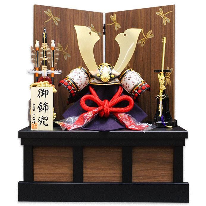 屏風にも金彩のとんぼ柄を施したダークブラン木目調の飾り台がおしゃれなコンパクトサイズの兜飾りです。